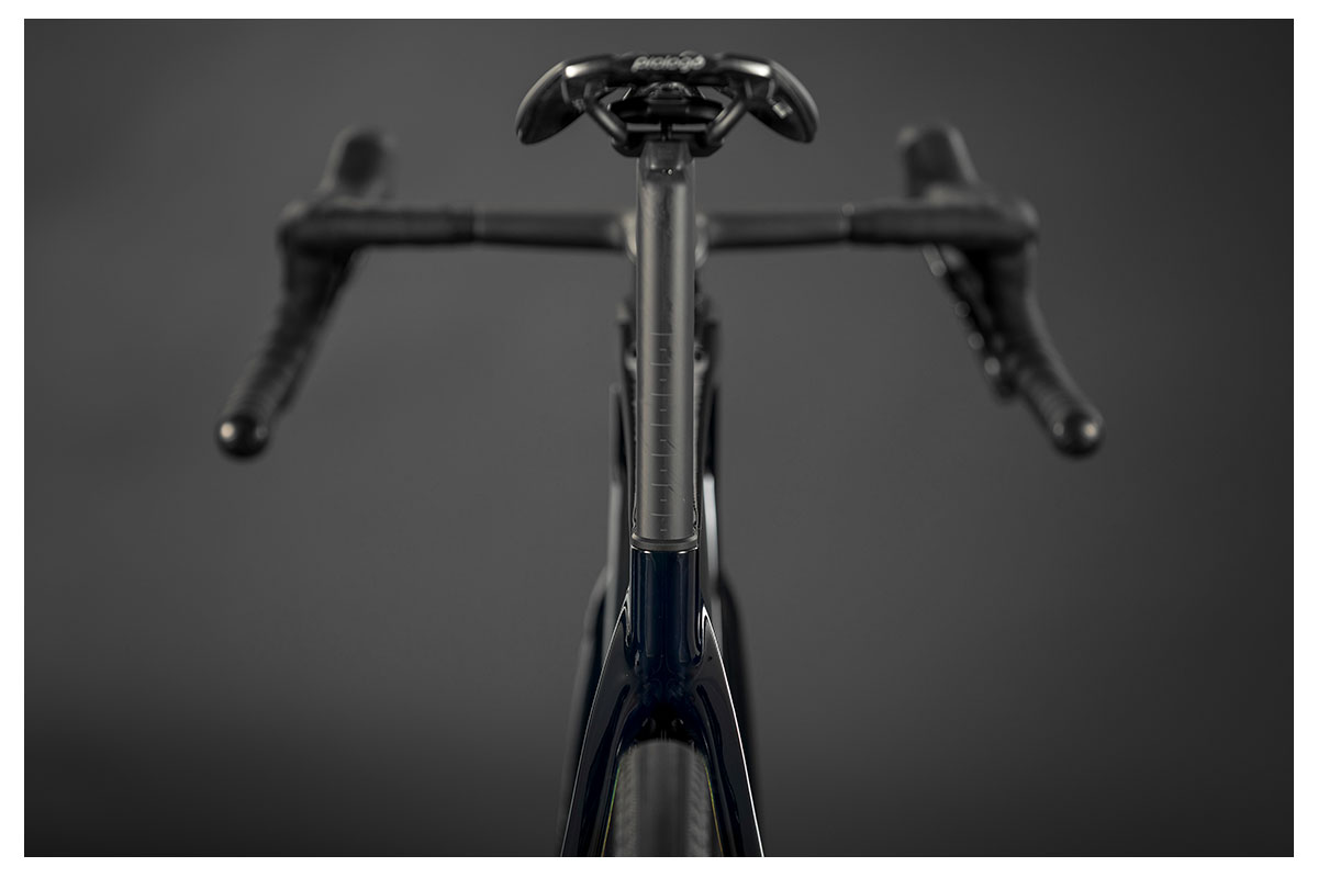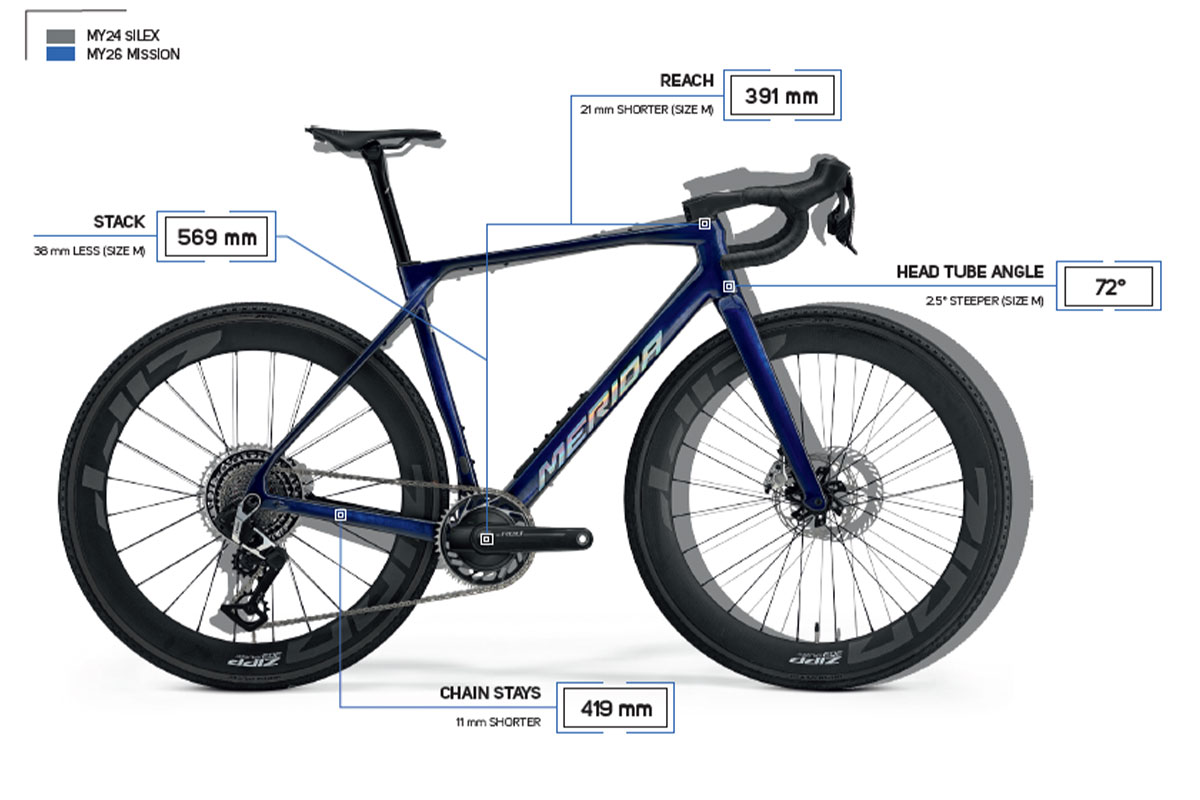 Every angle and measurement has been dialled in for speed and control. A 72° head angle keeps steering sharp and confident over rough terrain, while the 391 mm reach ensures agility across gravel, tarmac, and everything in between. The low stack height (569 mm) positions the rider in a powerful, aerodynamic stance — notably lower than both the Scultura Endurance (584 mm) and the Silex (607 mm). Combined with a low bottom bracket, the Mission delivers outstanding stability, giving riders the sensation of sitting in the bike rather than on top of it, boosting handling and confidence through technical descents and fast gravel corners.