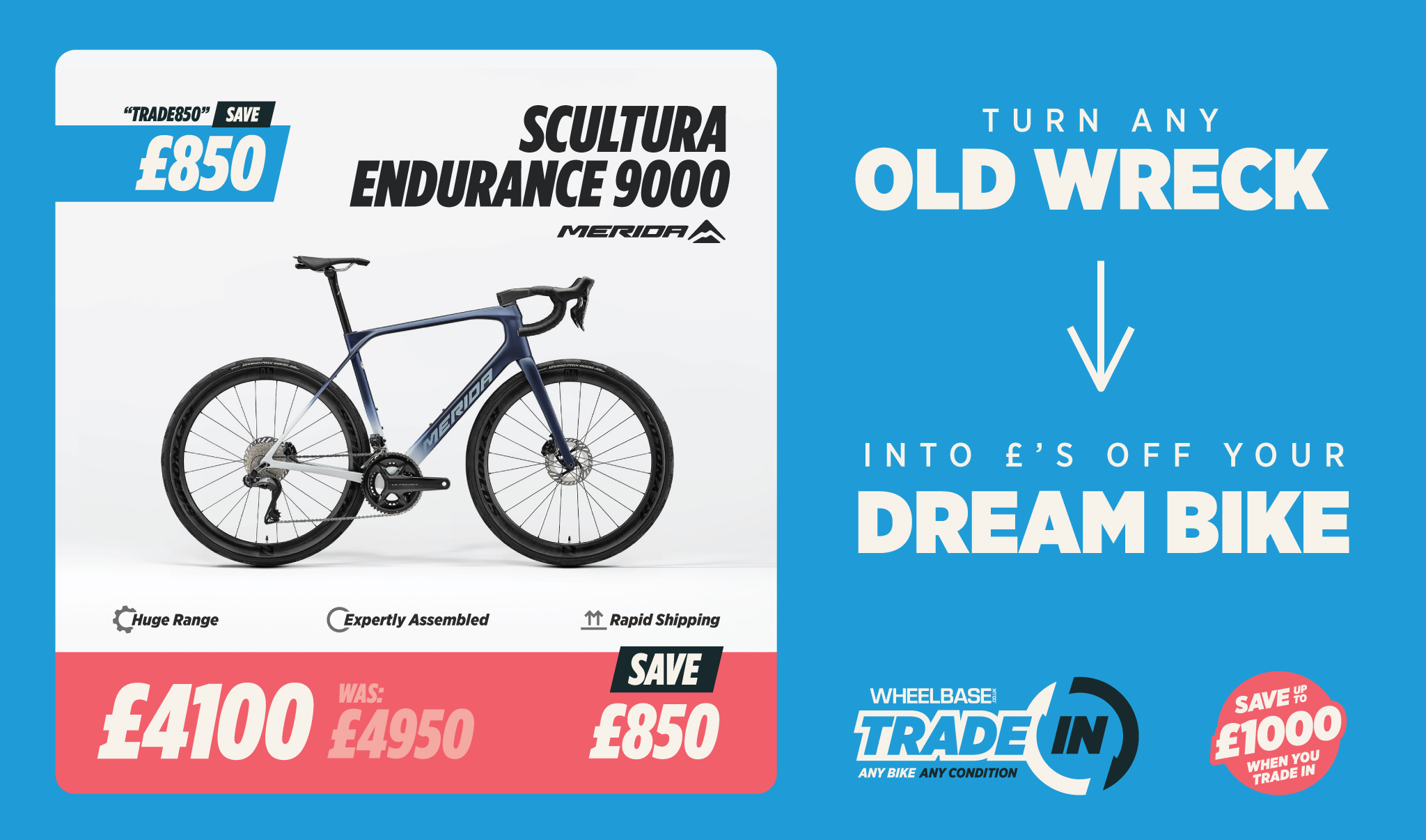 ‘Trade-In’ applies to in-stock bikes only | ‘Trade-In’ discount is available in store, online or via telesales | ‘Trade-In’ discount does not apply to clothing, helmets, shoes, parts and accessories | ‘Trade-In’ discount does not apply to Brompton Bikes | ‘Trade-In’ discount can only be used on full RRP prices. It can not be applied to an already reduced item | ‘Trade-In’ discount can not be used in conjunction with any other promotion or offer | ‘Trade-In’ discount can not be used with purchases through CycleScheme or any other ride-to-work scheme | ‘Trade-In’ discount can not be used with purchases using 0% finance or PayPal Credit | Minimum new bike value £750 | Only one (1) ‘Trade-In’ per new bike purchase | WHEELBASE reserves the right to withdraw the ‘Trade-In’ sale at any time.