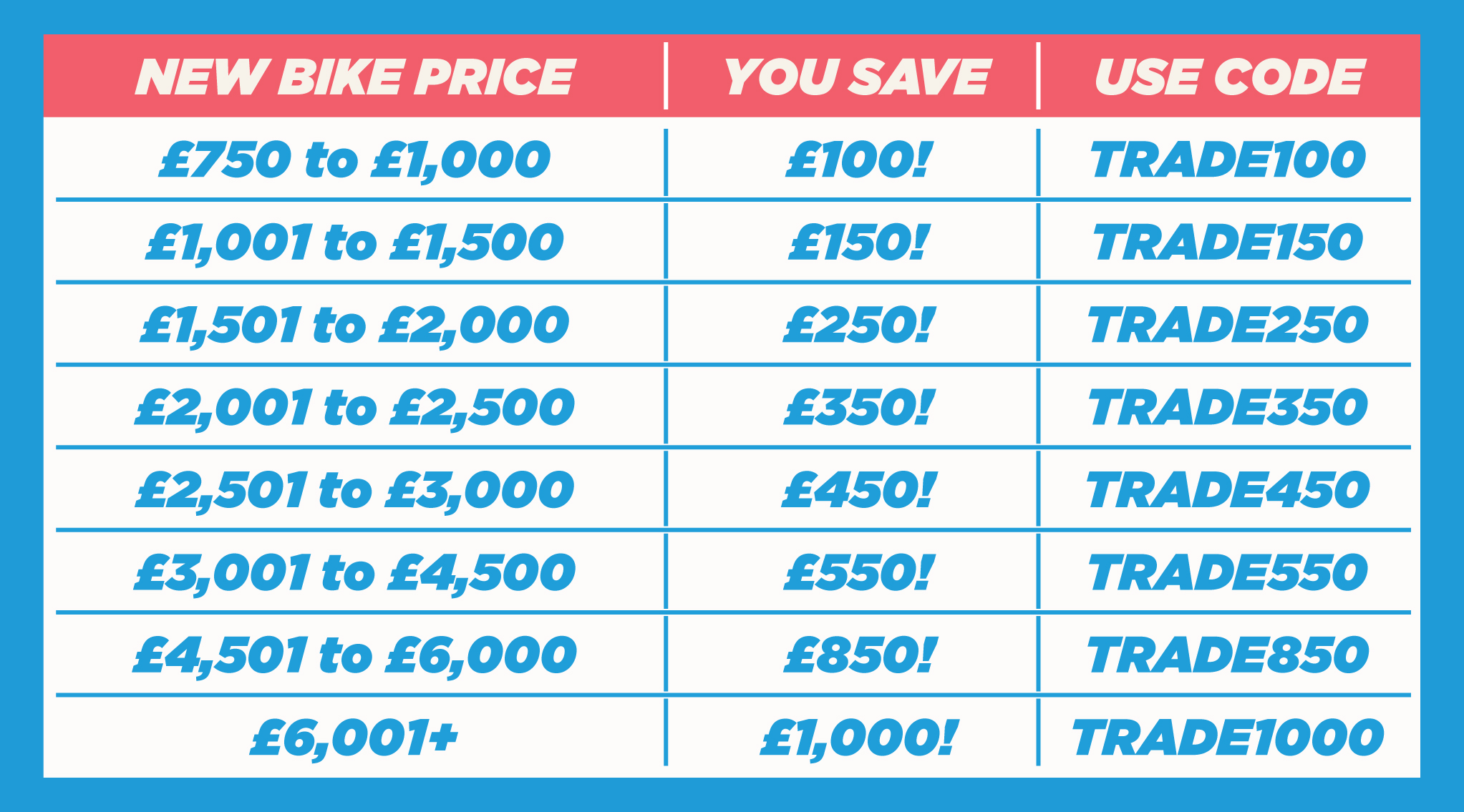 Example: If the chosen bike is £1,000, use TRADE100 as a coupon code at checkout to save £100. Making the cost of the bike £900. *Coupons are eligible on the cost of the bike only. Cost of shipping will be applied on top of the value of the bike.